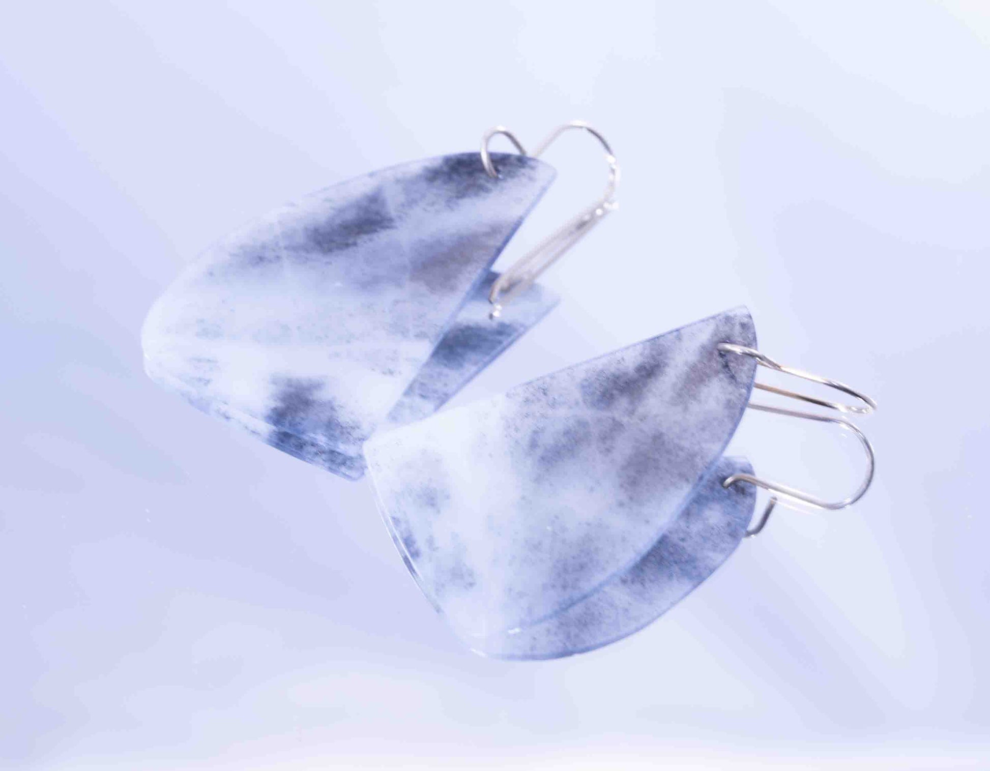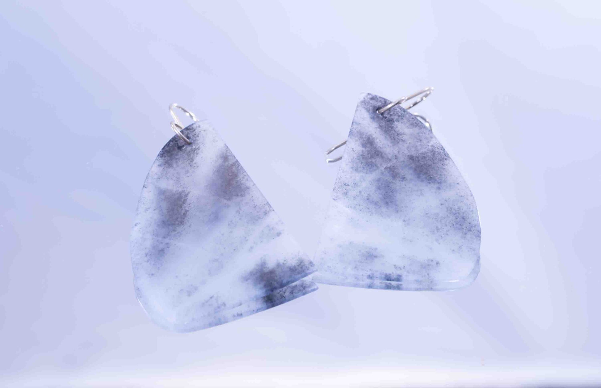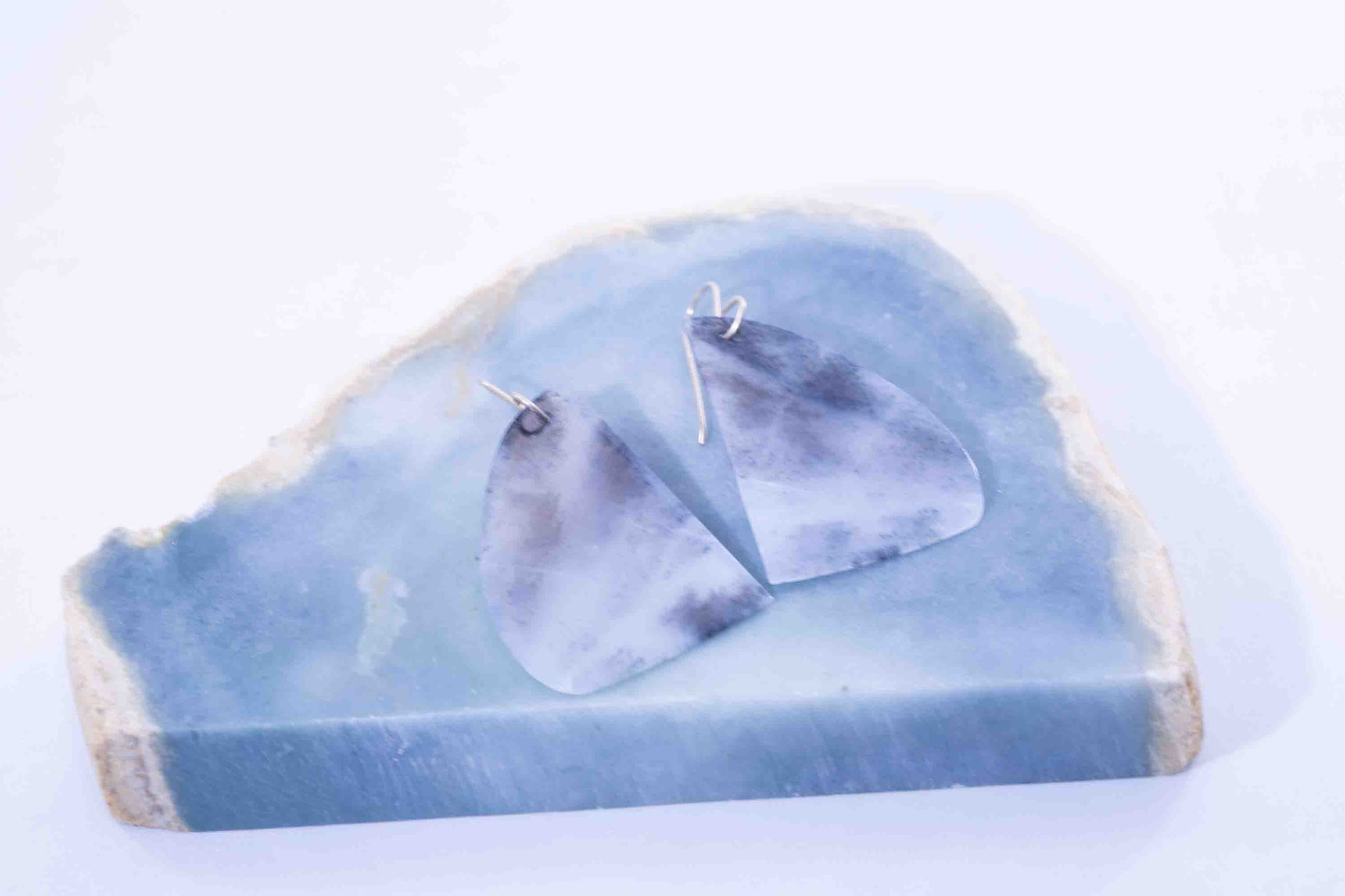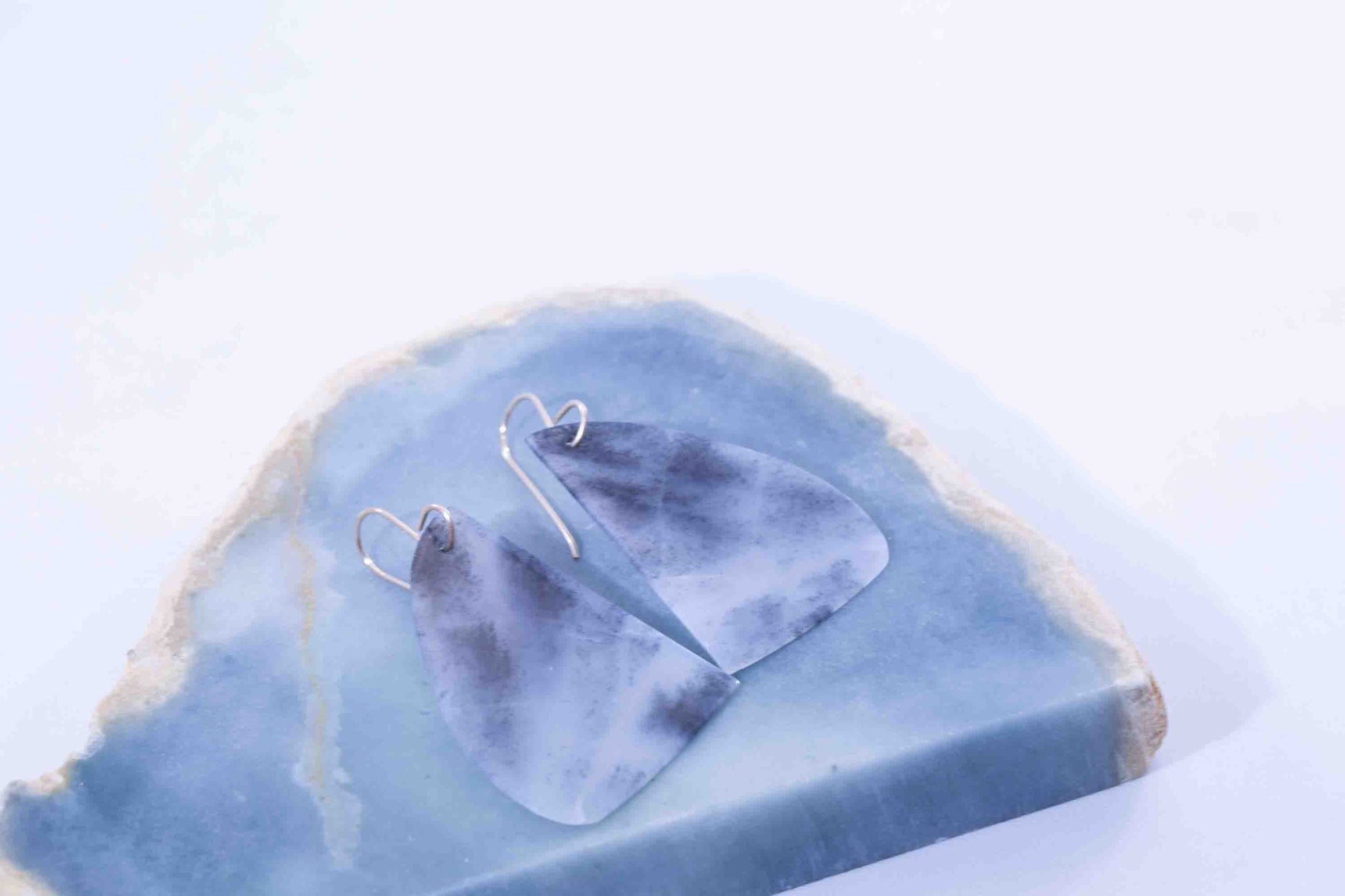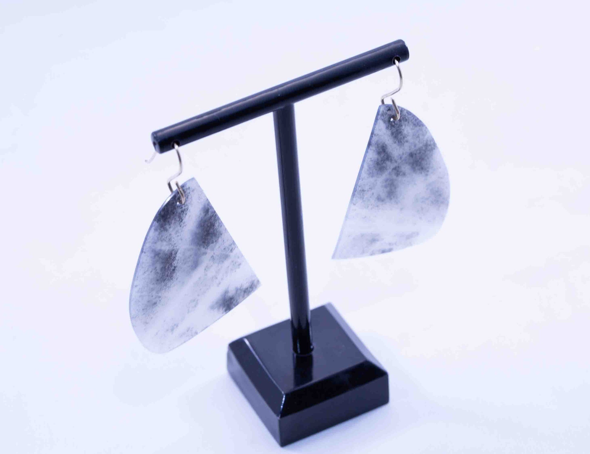 These striking dangle earrings feature hand-shaped discs of Chinese porcelain river jade in elegant black and white tones. Each piece is carefully crafted from natural stone, showcasing the flowing, organic patterns that give river jade its serene, river-like character. No two earrings are exactly alike, making every pair truly one-of-a-kind.