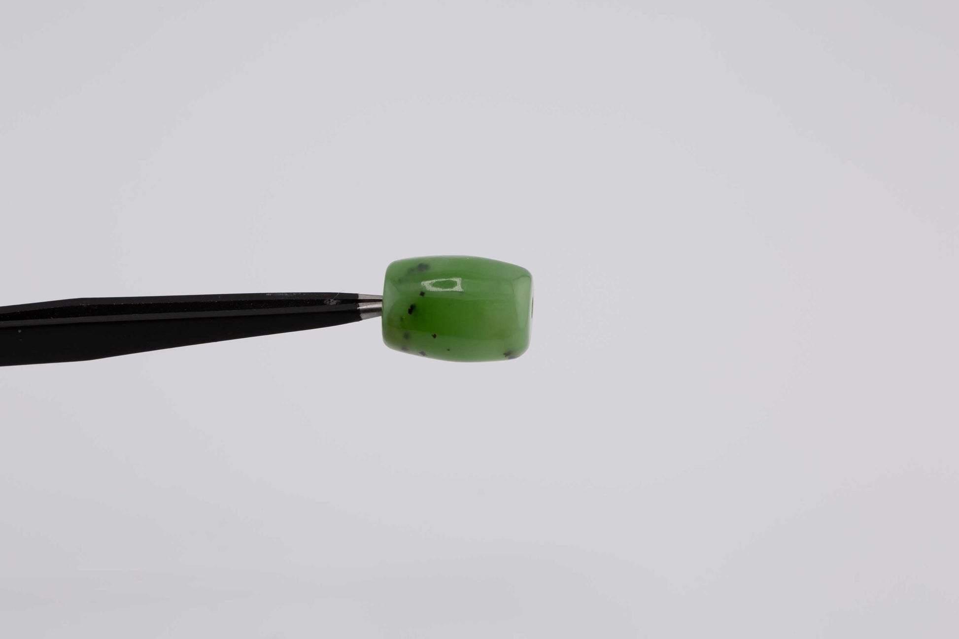Hand-carved Siberian apple green jade barrel bead featuring rich natural color with distinctive dark inclusions. This piece has been shaped and polished by hand to a smooth, high-gloss finish, bringing out the depth and character of the stone.