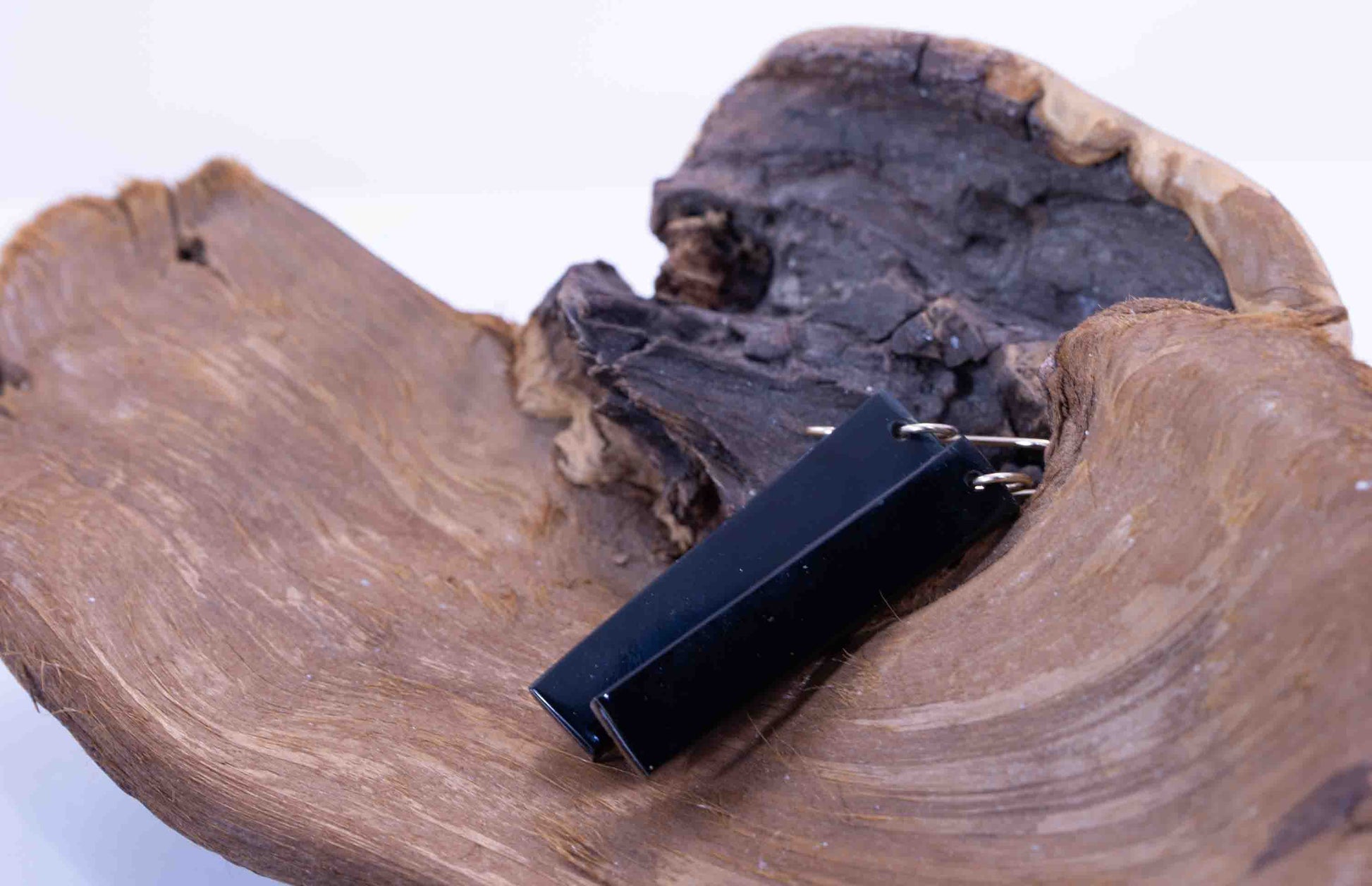 One side highlights the raw, textured rind of the stone, while the reverse reveals a smooth, deep black finish. This contrast creates a versatile design that can shift from earthy and organic to sleek and refined.